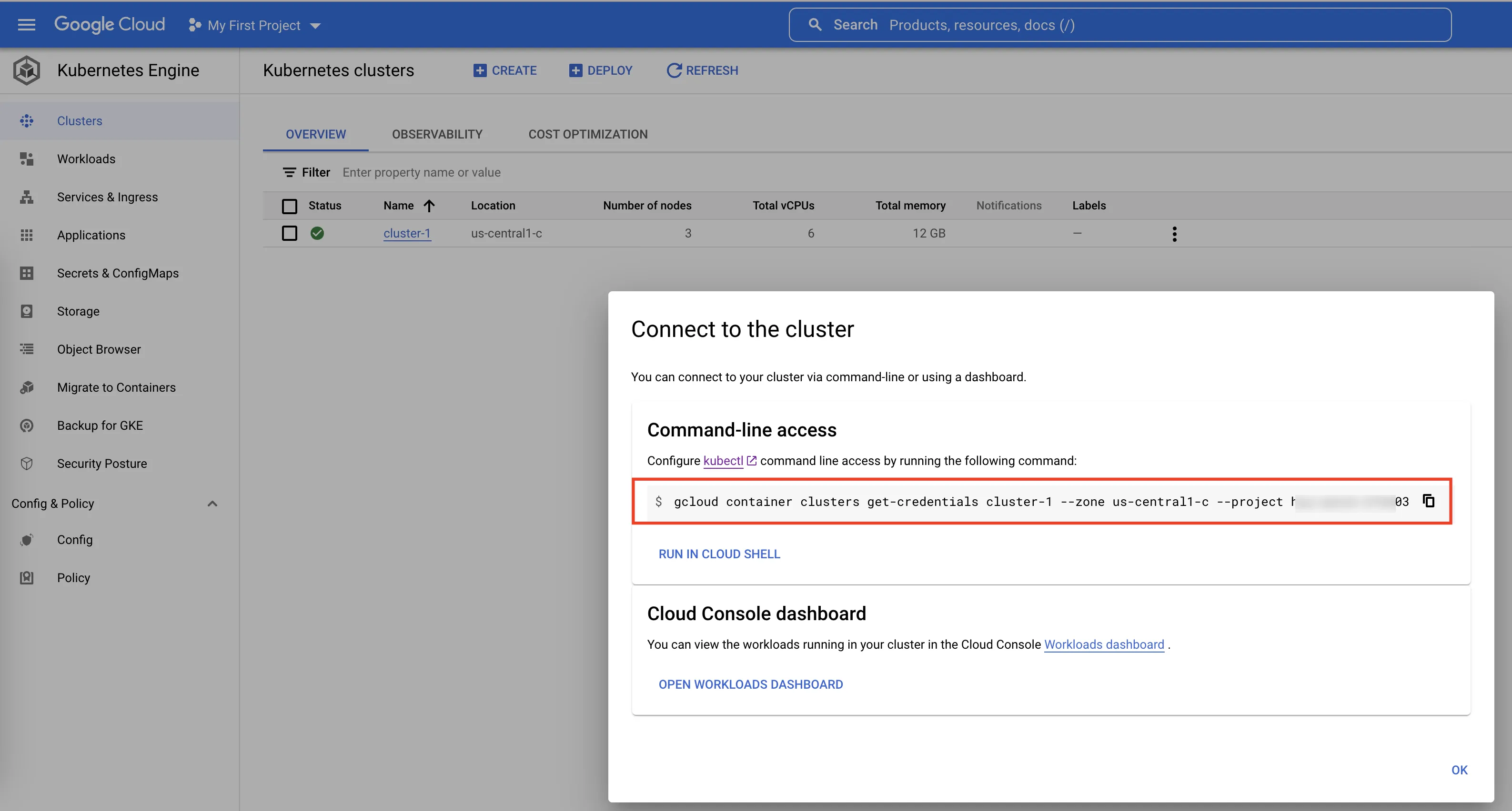 ~ gcloud container clusters get-credentials cluster-1 --zone us-central1-c --project my-project